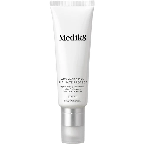 Advanced Day Ultimate Protect é o protetor solar SPF 50+ PA++++ da Medik8 com enzimas de reparação de DNA de próxima geração e o mais avançado escudo ambiental 360° de sempre.