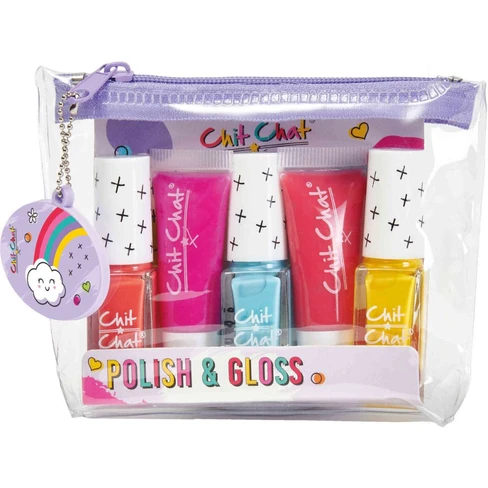 Get ready to shine with the Chit Chat Polish and Gloss set! A vibrant collection of nail polishes and lip glosses for kids, all in a stylish reusable bag.