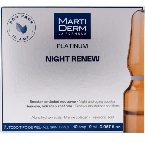 Transform your nighttime skincare with Martiderm Platinum Night Renew Ampoules—designed to hydrate, firm, and renew for a youthful glow.