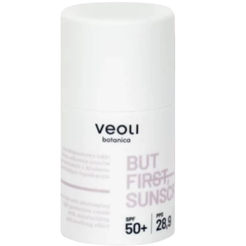 Introducing Veoli Botanica's But First, Sunscreen Face Cream - a revolutionary SPF 50+ light protective cream with anti-photoaging benefits. Moisturizes, soothes, and reduces signs of aging, leaving skin radiant and protected. Perfect for sensitive skin.